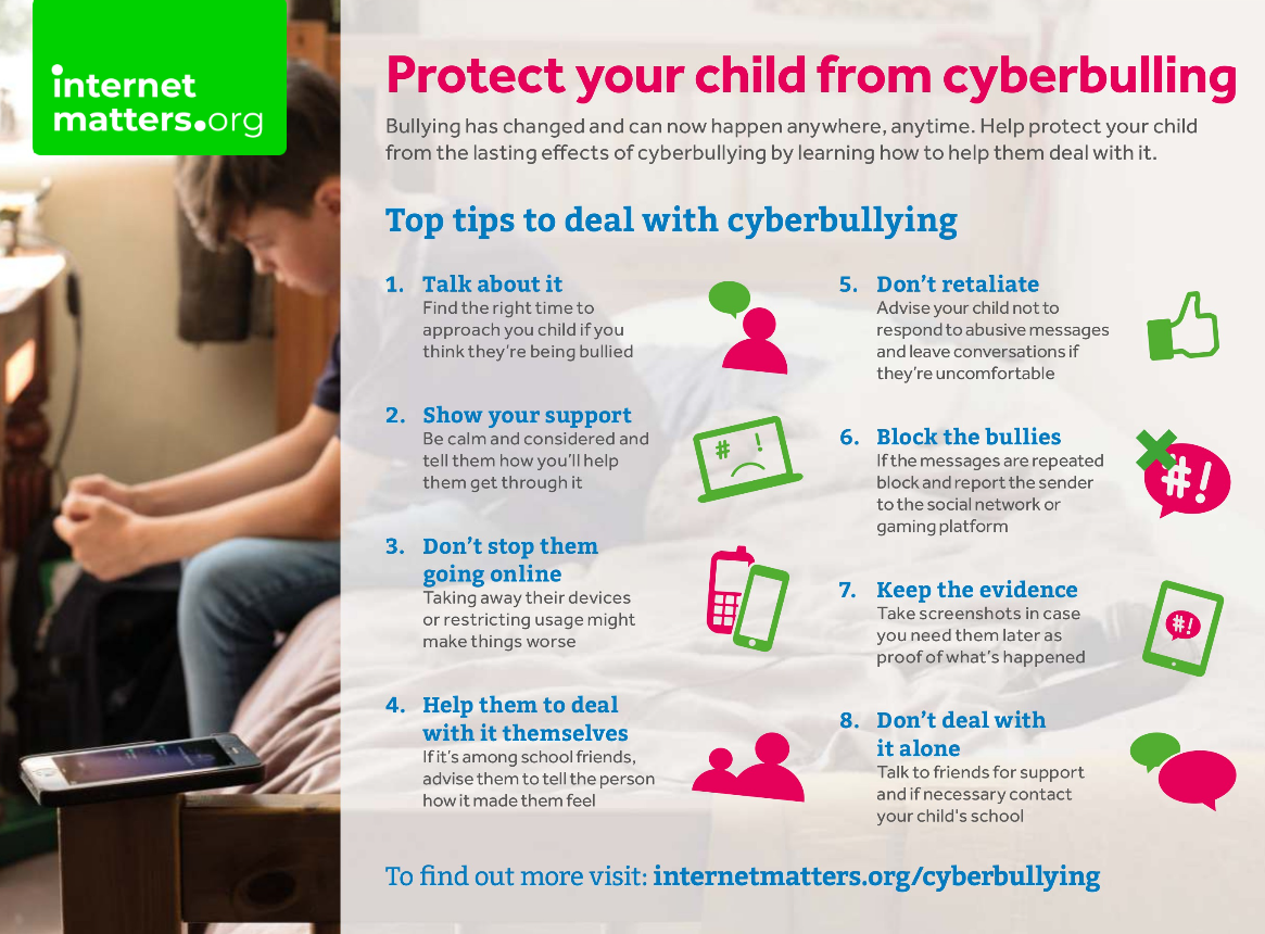 It’s important to be able to share evidence of what has happened. Although it will be tempting for your child to delete distressing messages, without proof, schools, service providers or the police are limited as to how they can respond.